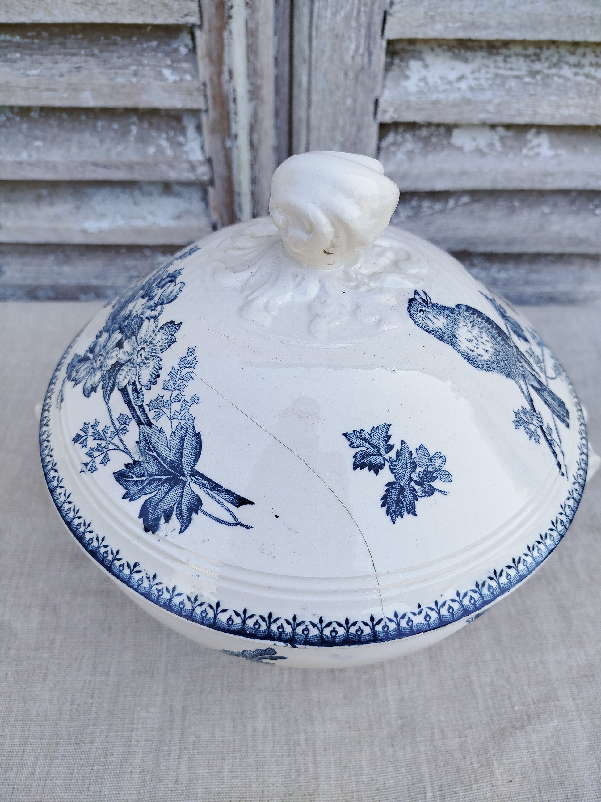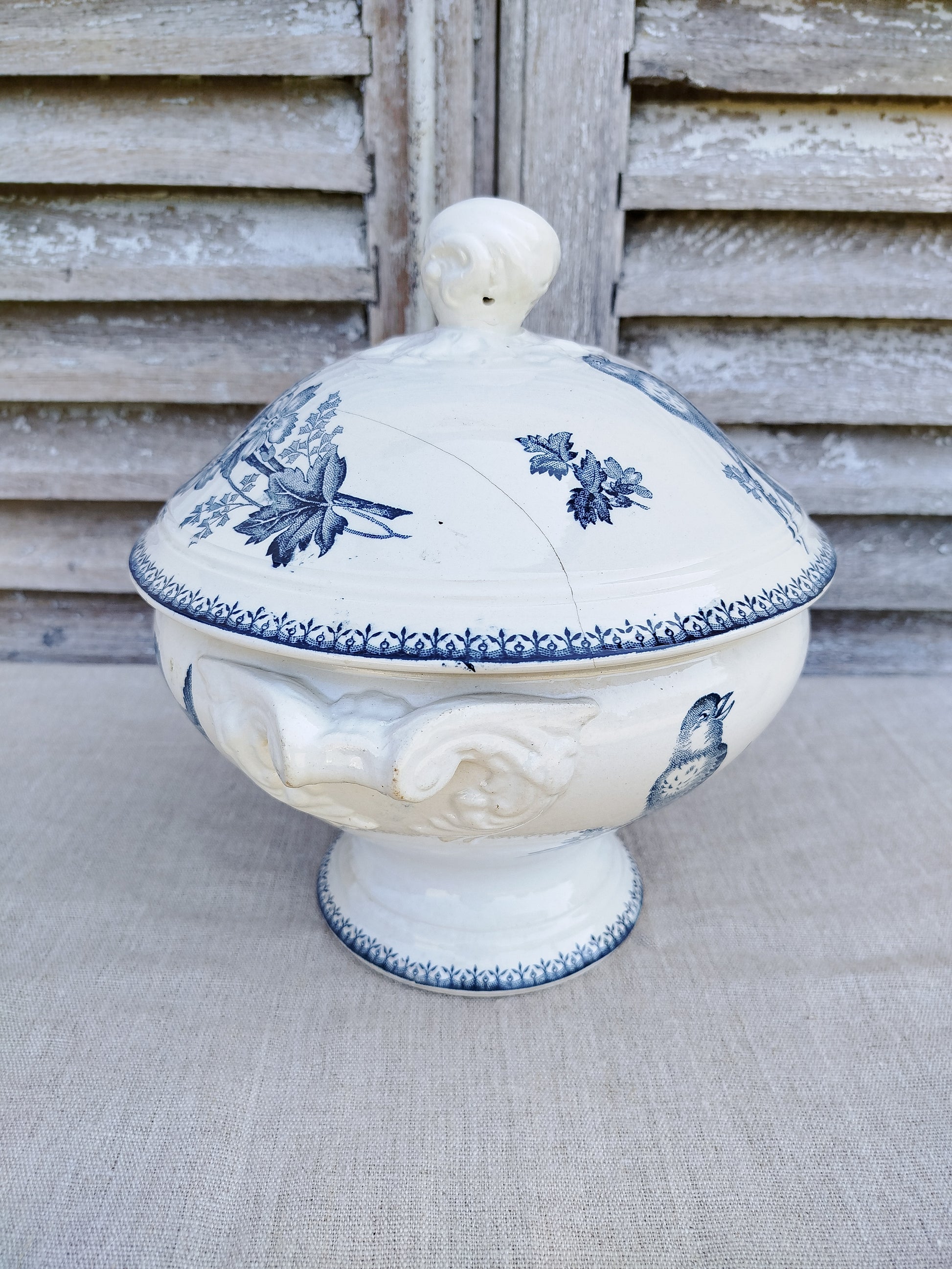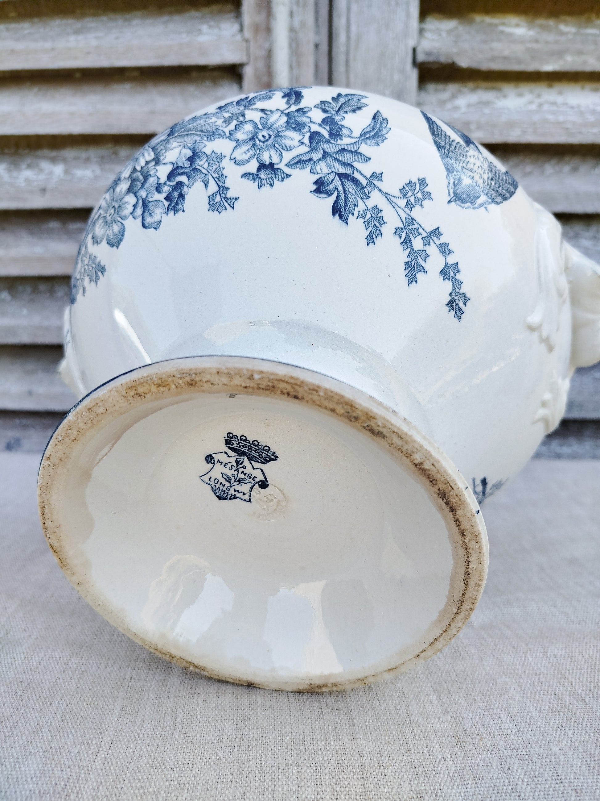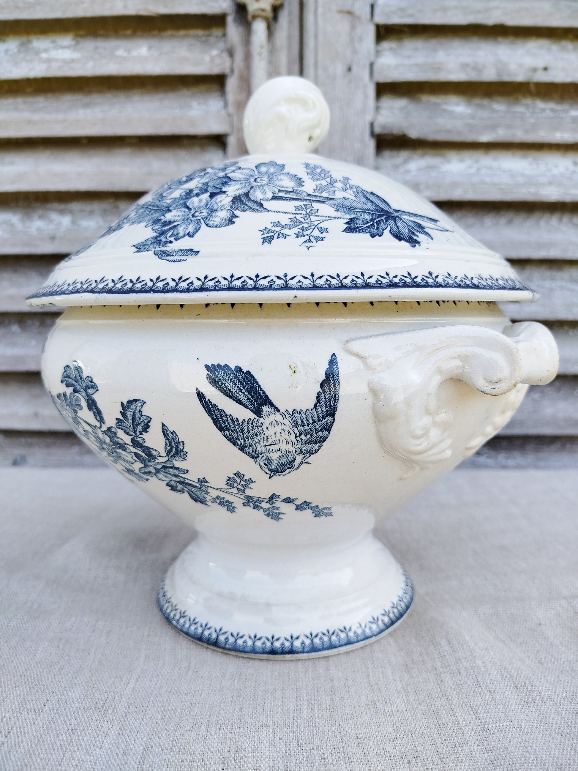 Il s'agit du modèle " Mésange " avec un décor floral en bleu, accompagné de trois petites mésanges réparties sur les deux côtés, ainsi que sur le couvercle.