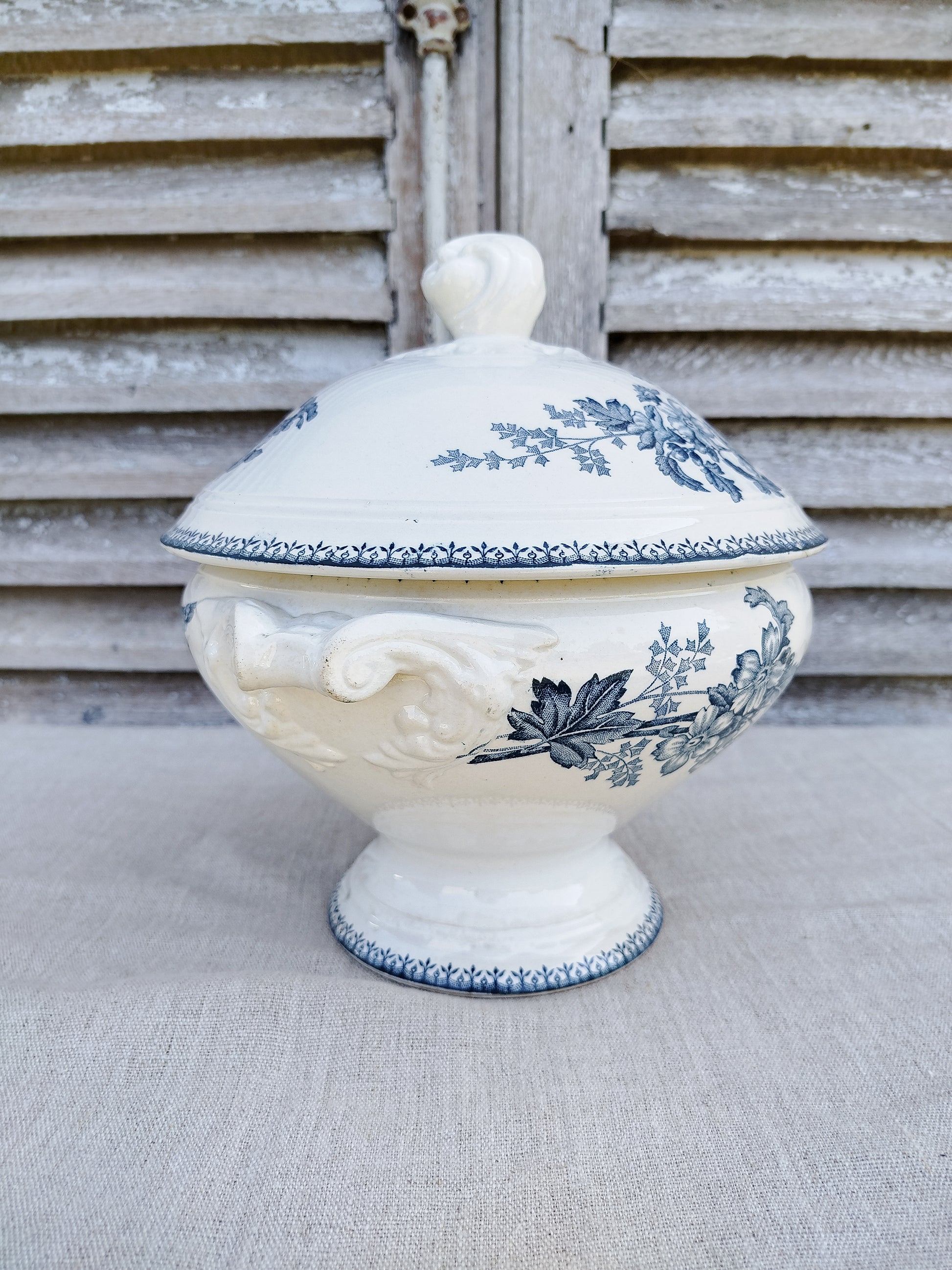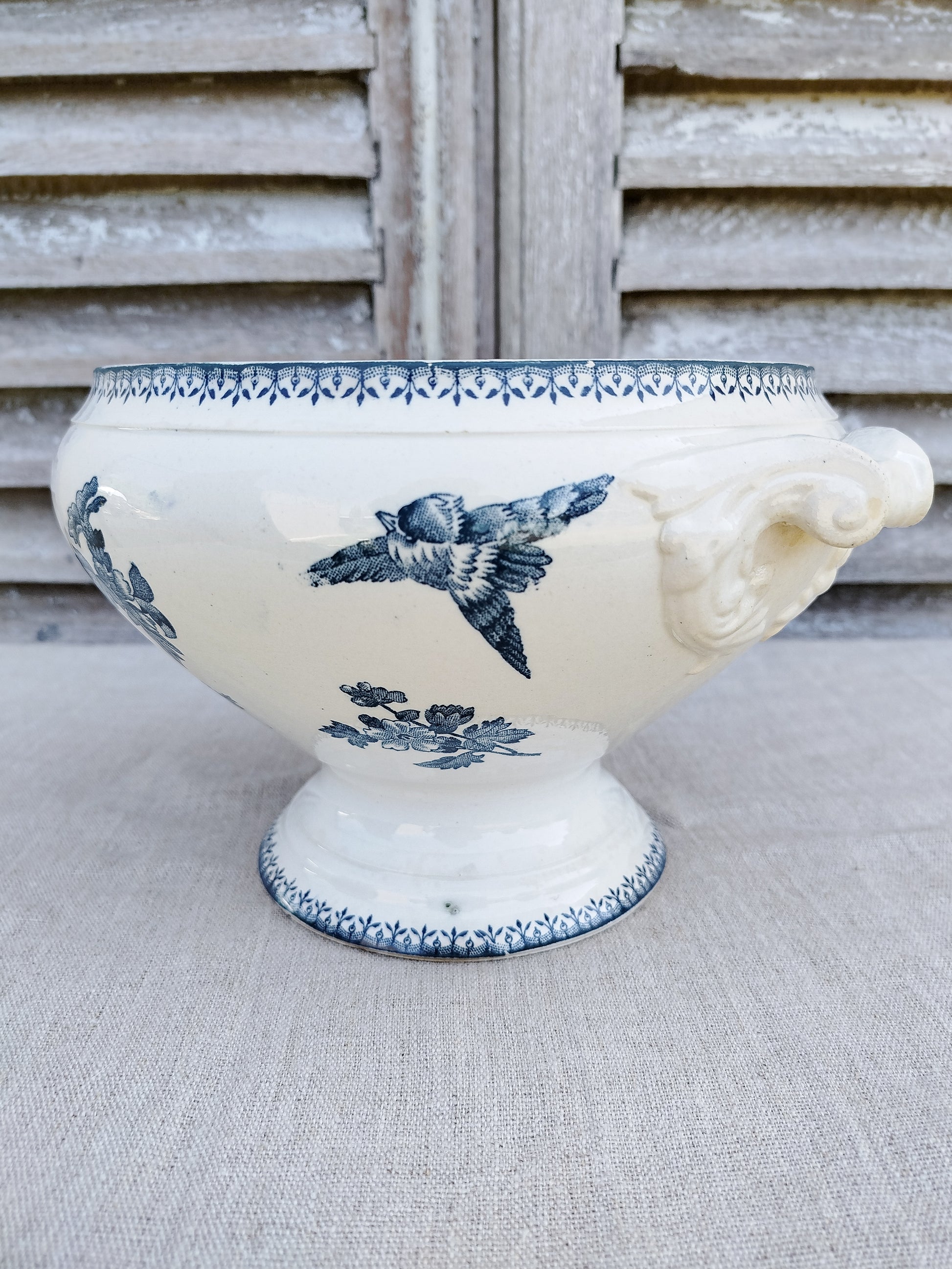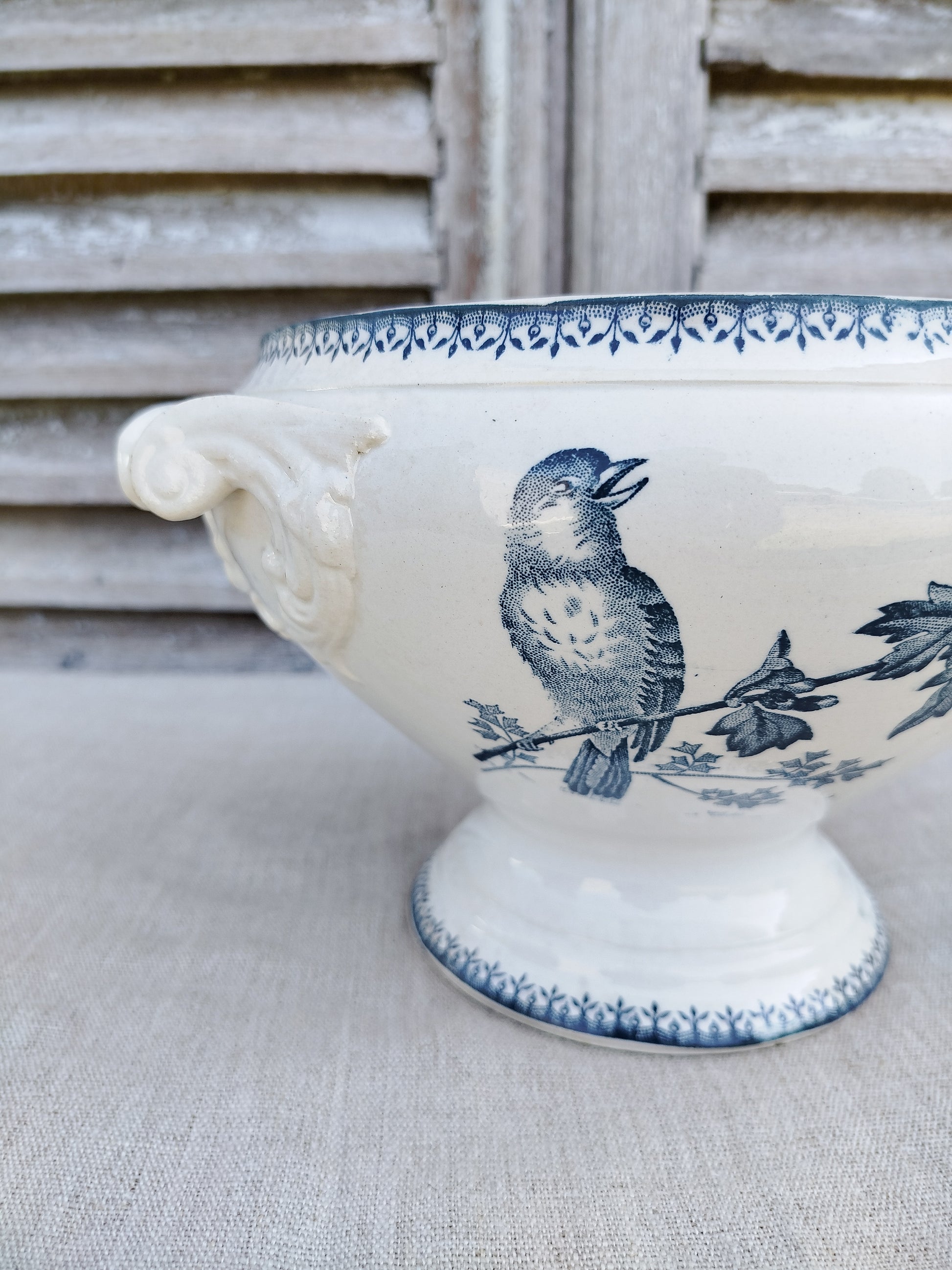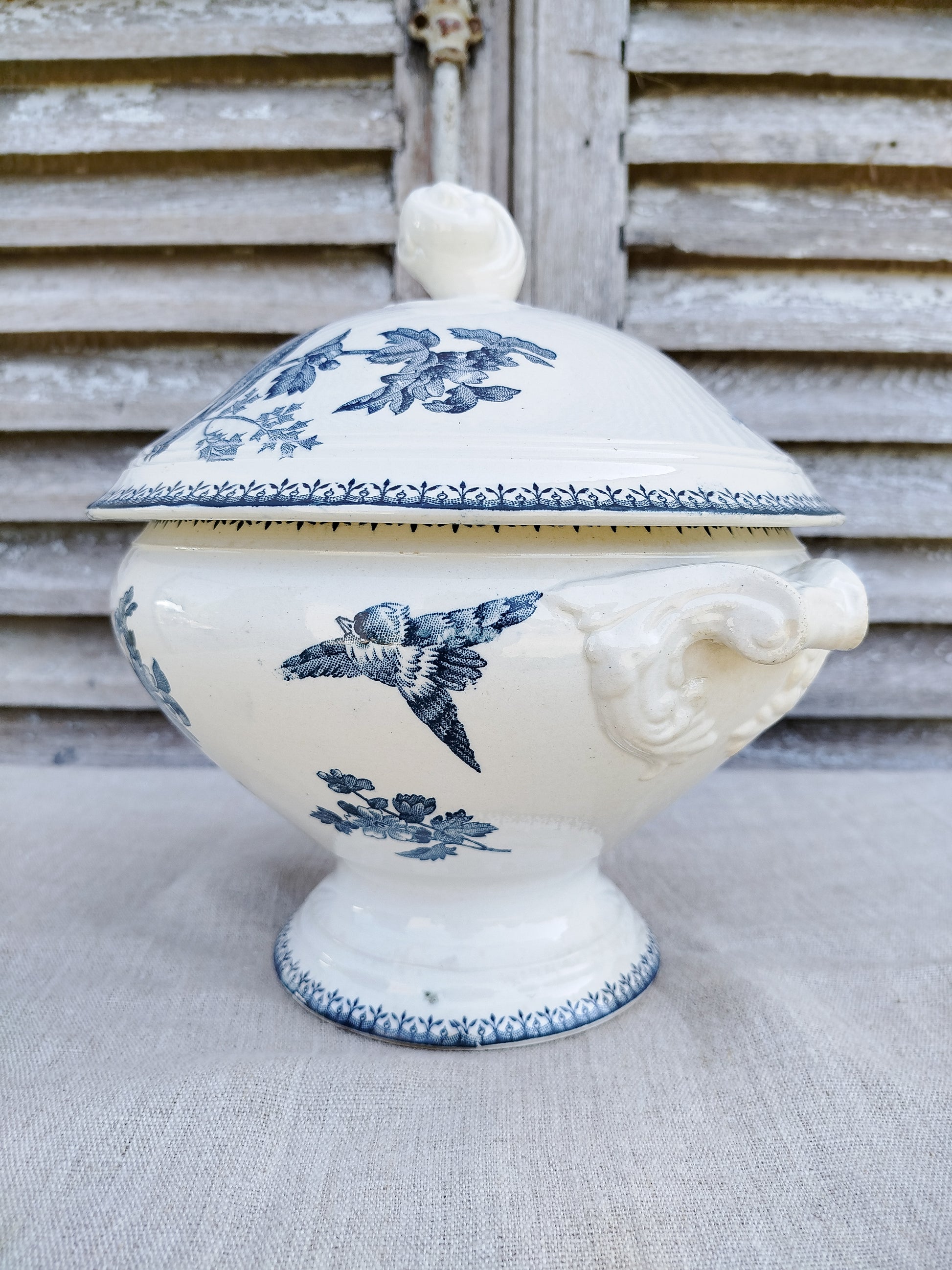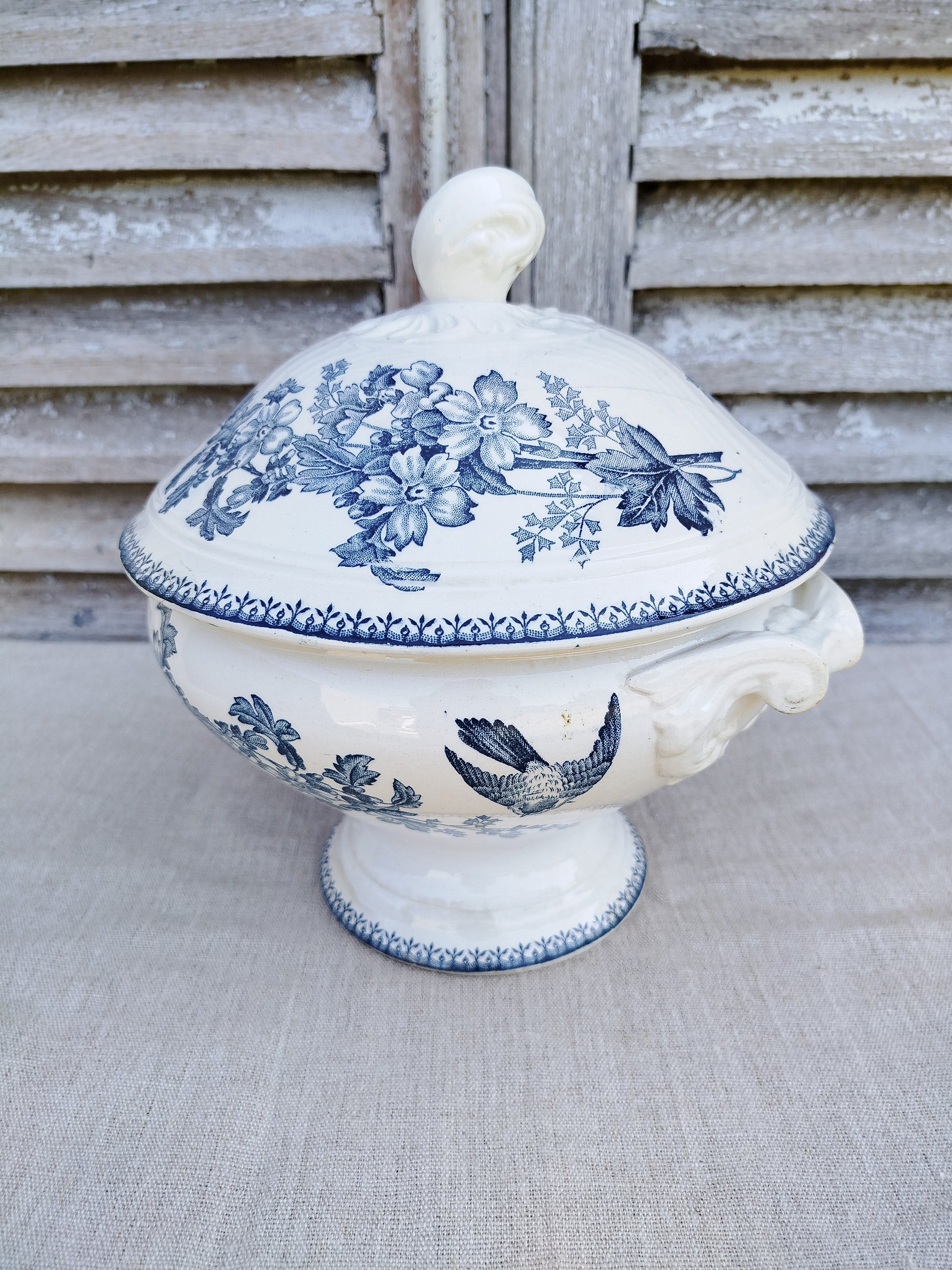 Il s'agit du modèle " Mésange " avec un décor floral en bleu, accompagné de trois petites mésanges réparties sur les deux côtés, ainsi que sur le couvercle.
