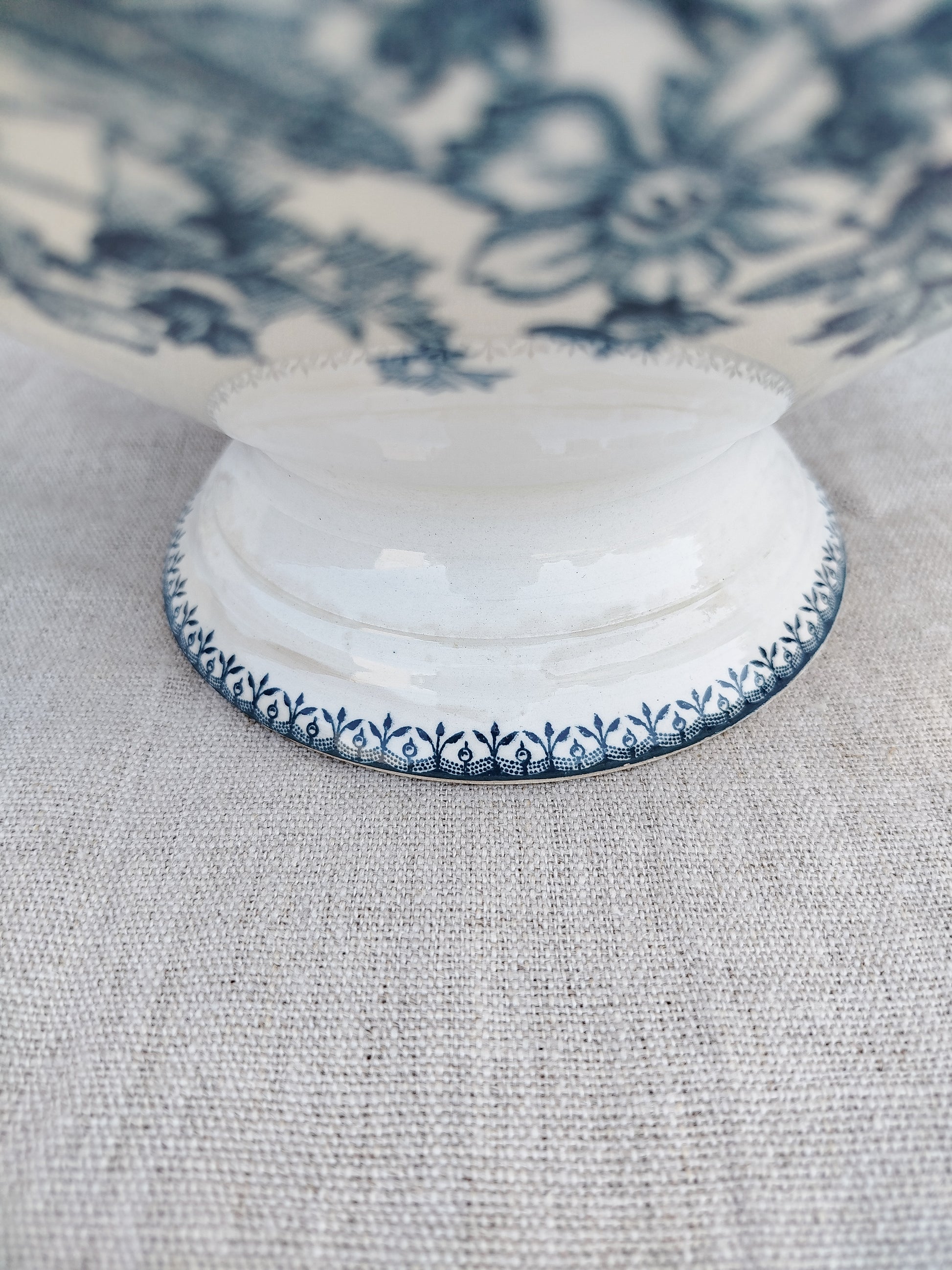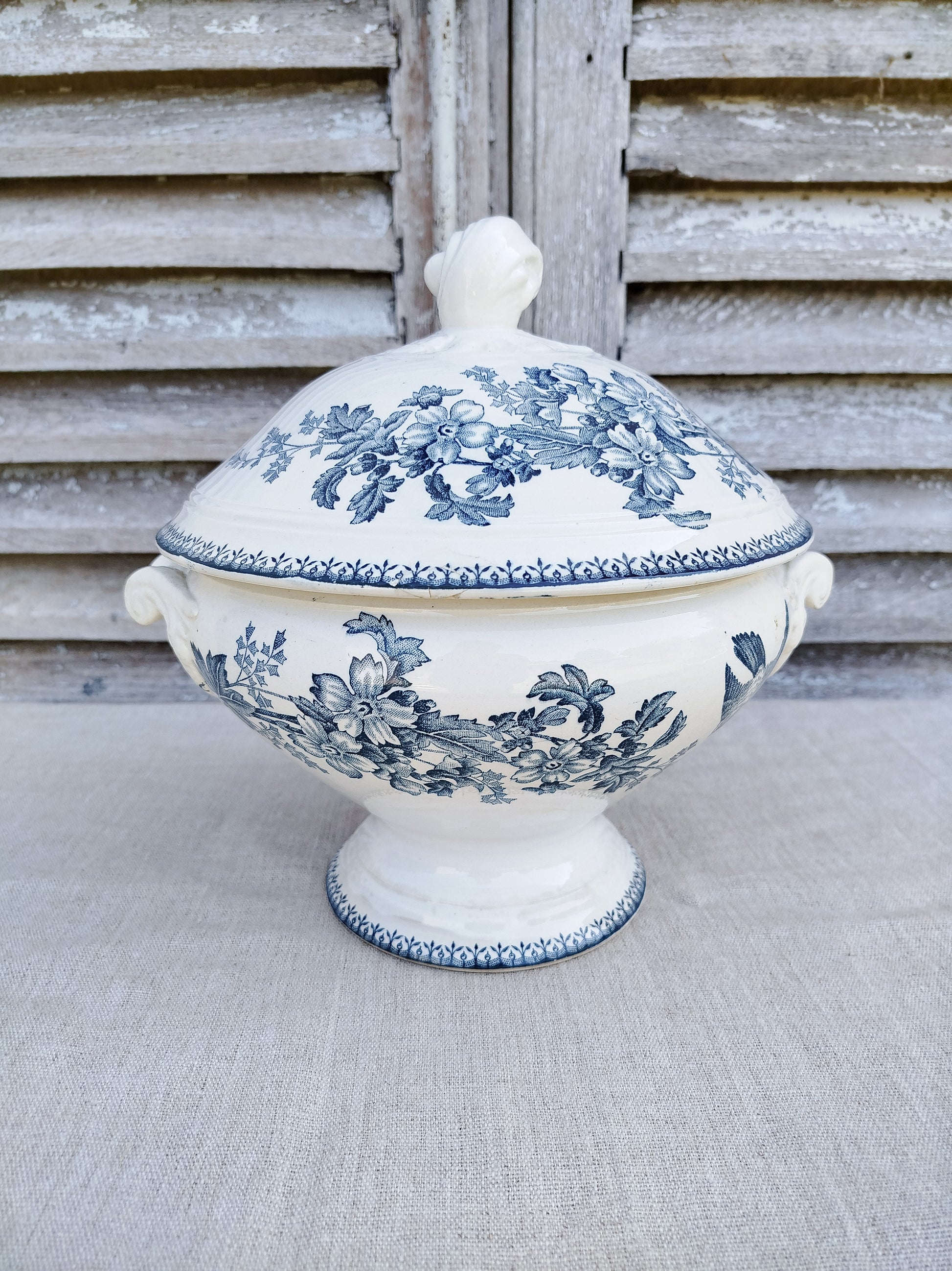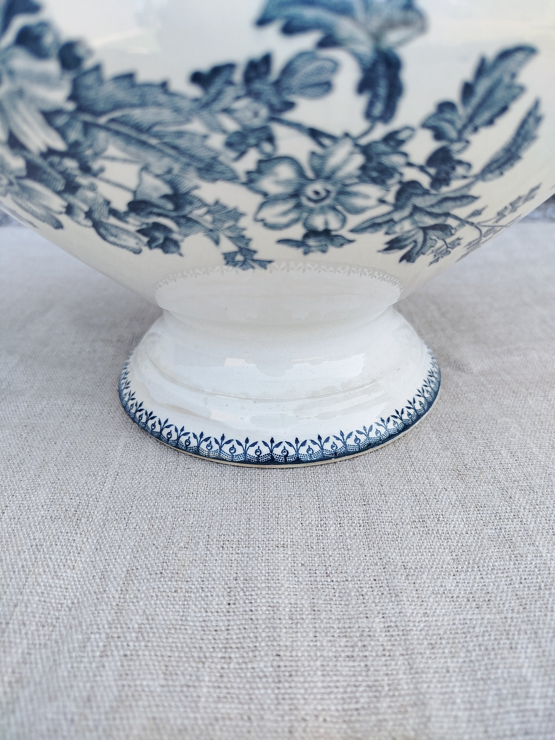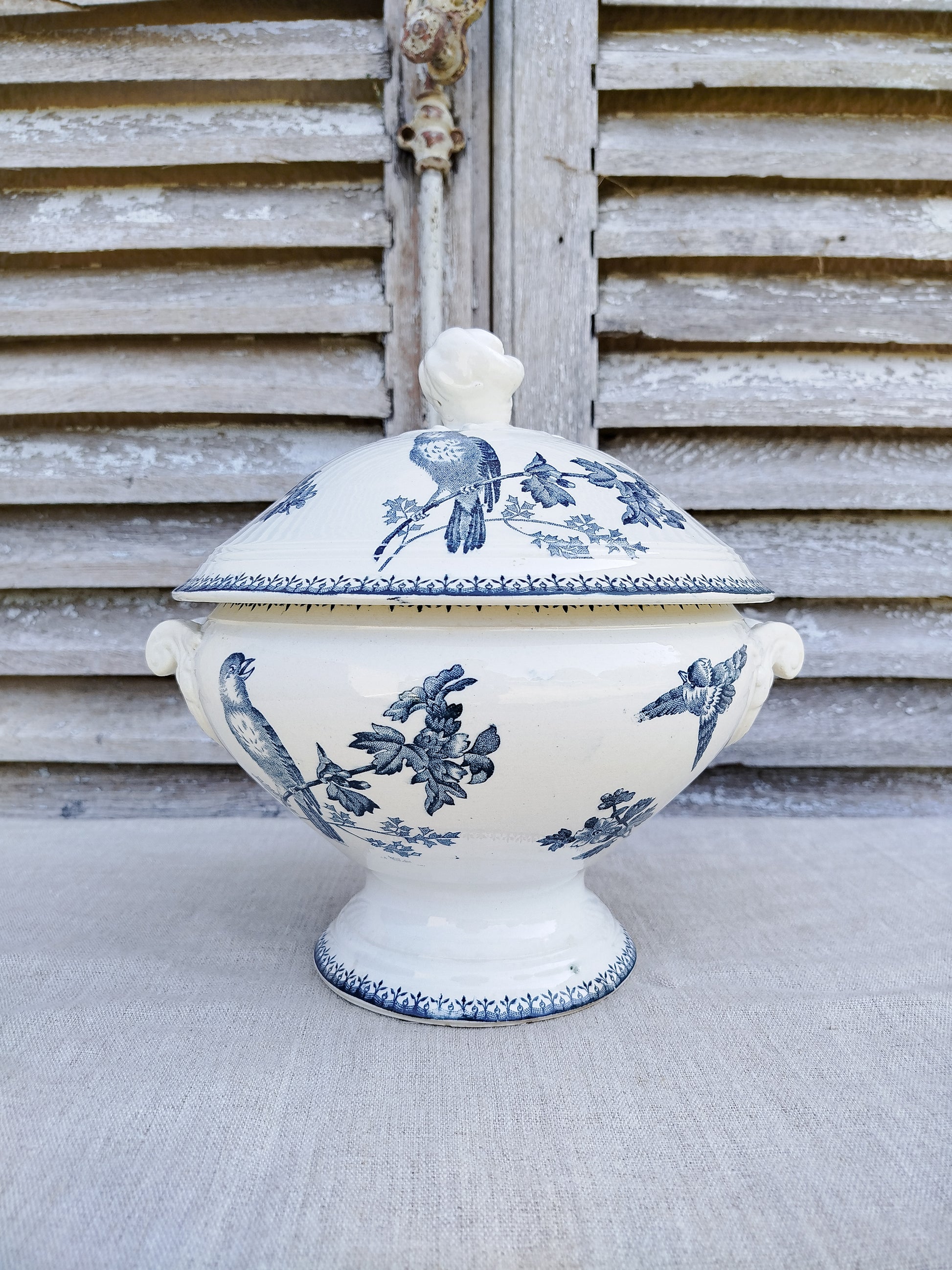 Il s'agit du modèle " Mésange " avec un décor floral en bleu, accompagné de trois petites mésanges réparties sur les deux côtés, ainsi que sur le couvercle.