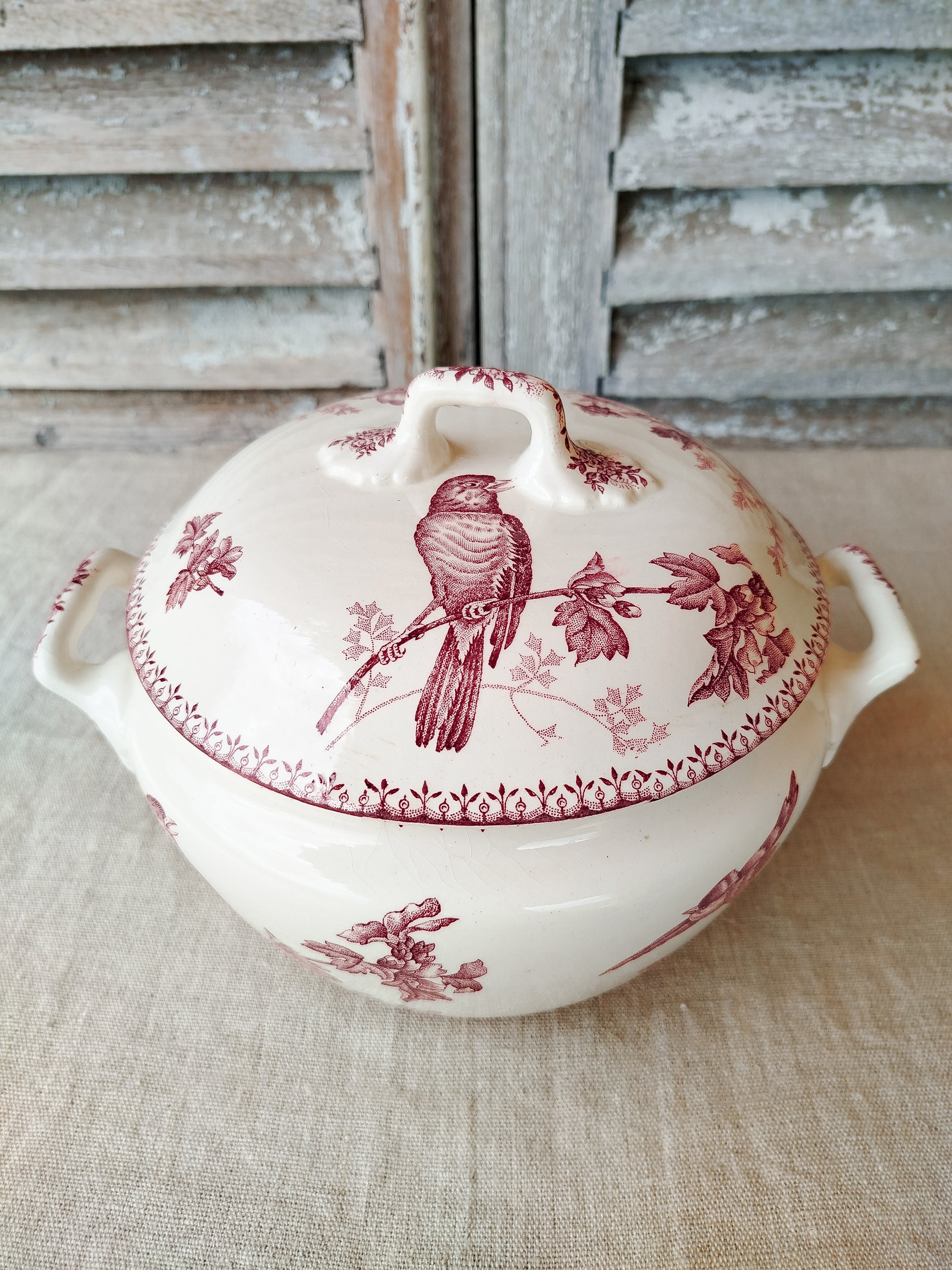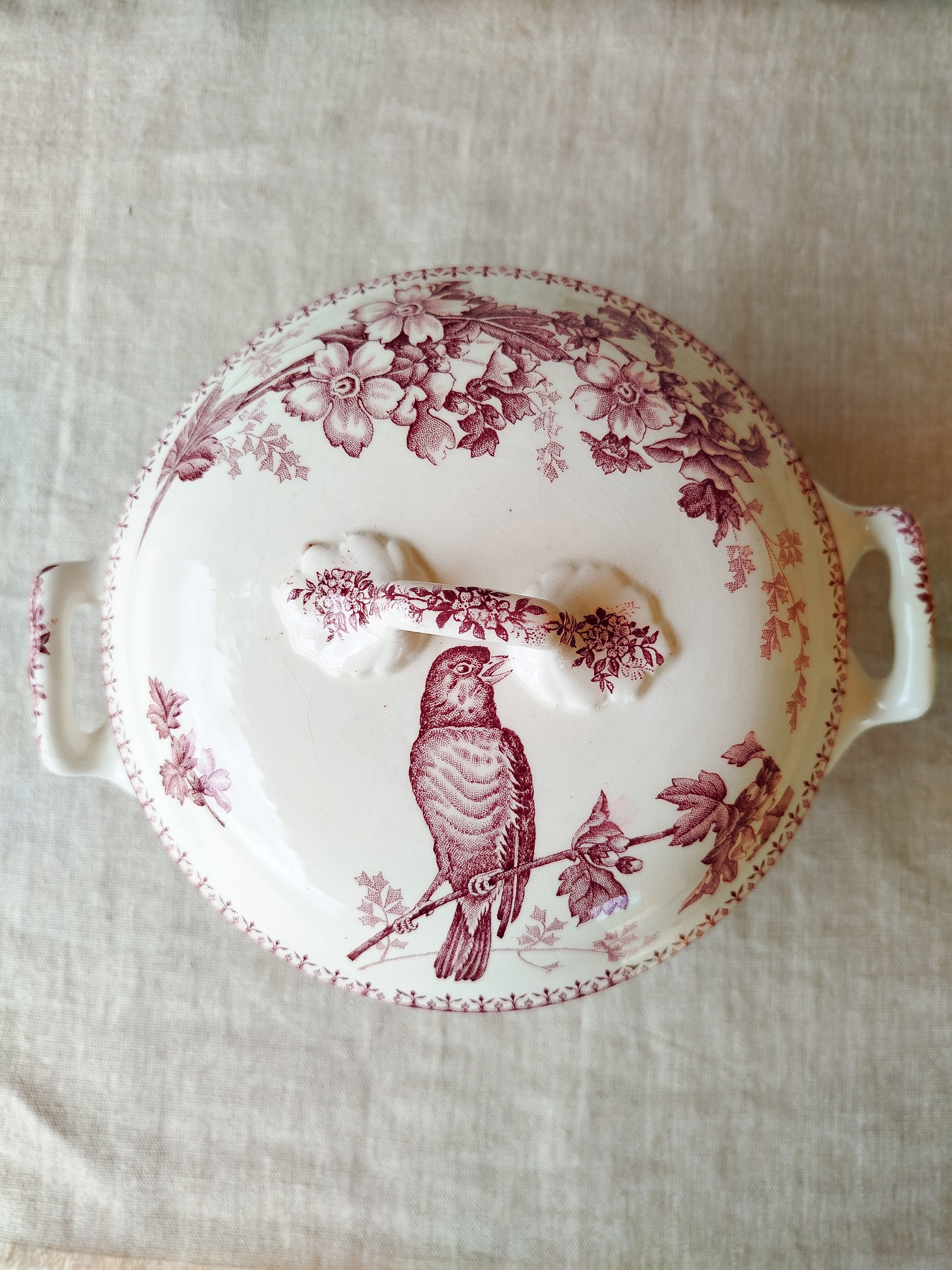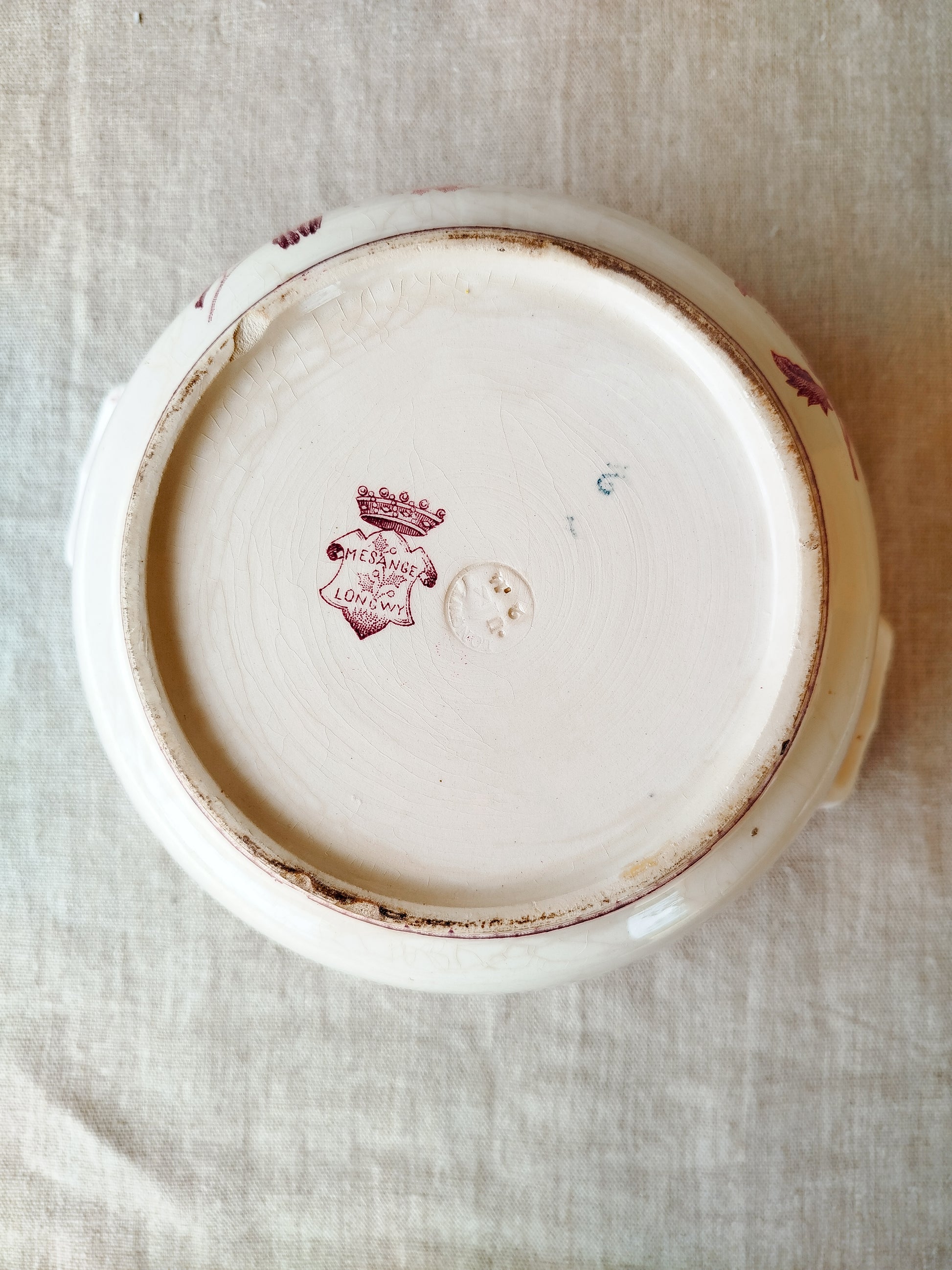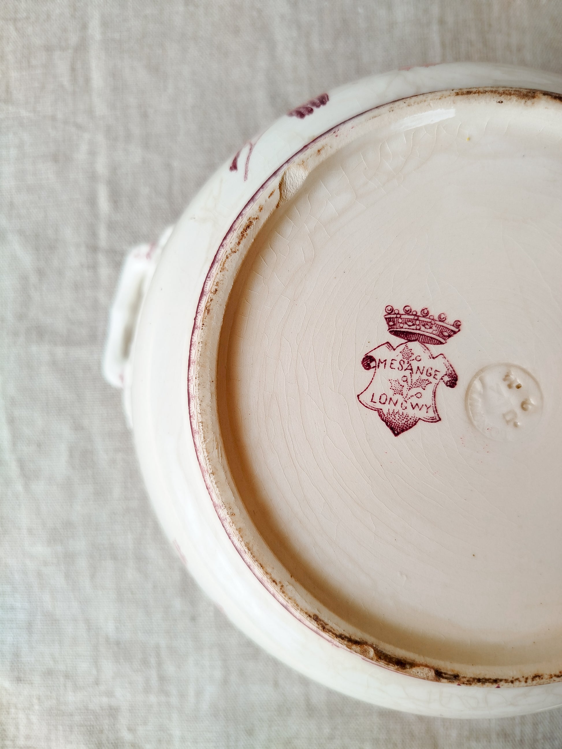 La soupière est estampillée au dessous avec la mention : " Mésange Longwy" ainsi qu'un tampon en creux : " Longwy 2 14 " pour la date de fabrication : février 1914.