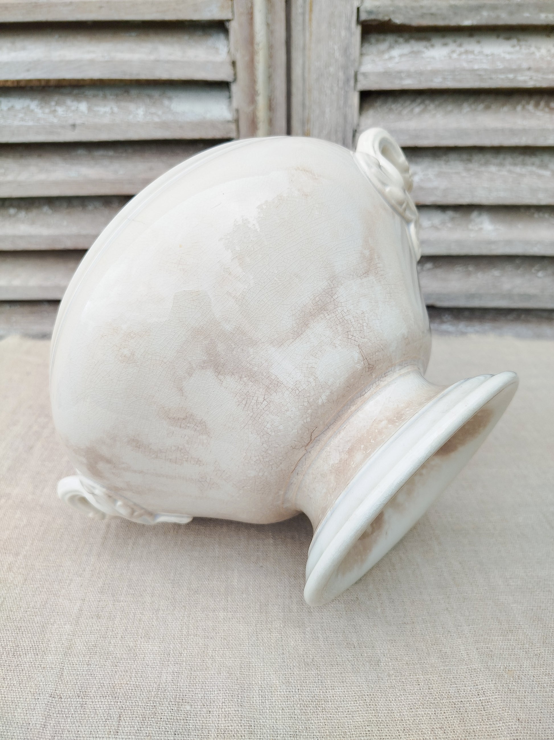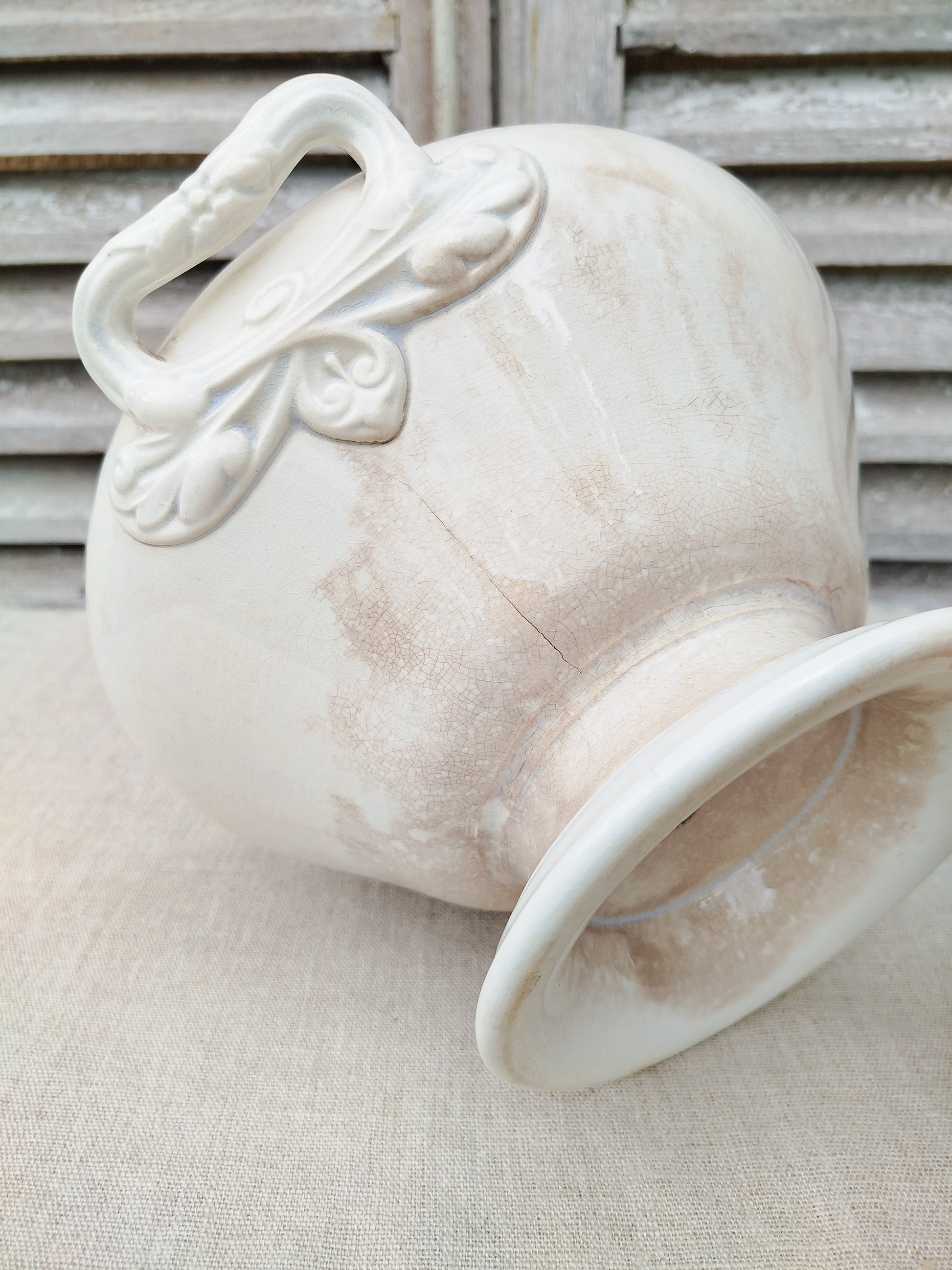 En faïence blanche, elle est en partie recouverte d'une patine ancienne de couleur beige foncé, ou marron. De jolies craquelures d'émail ajoutent à son charme..