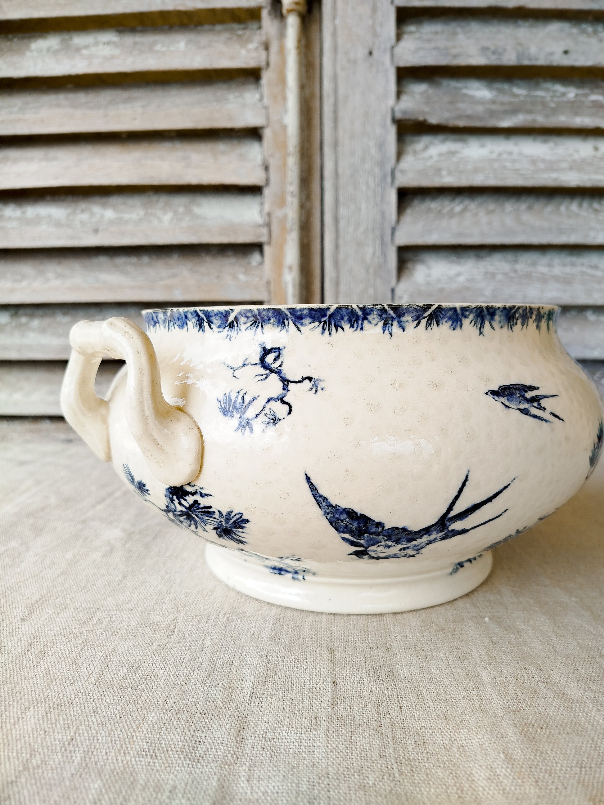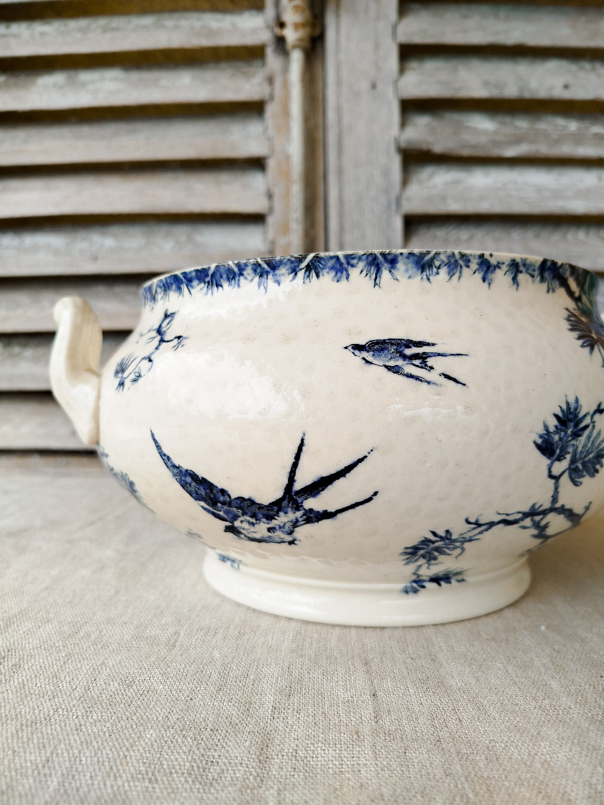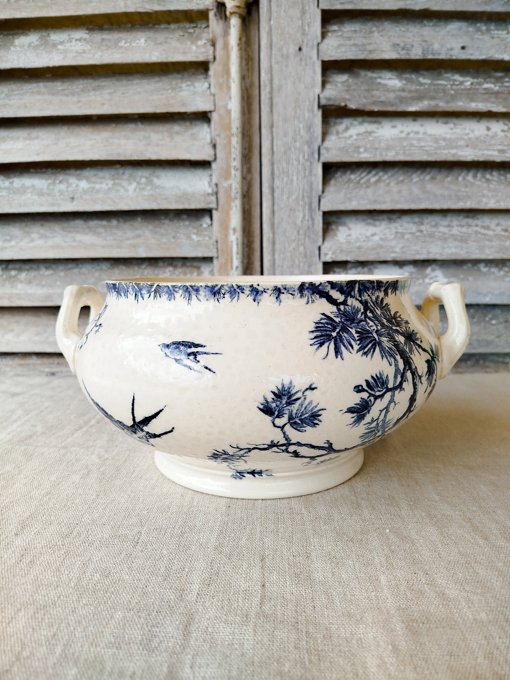 Le décor, en bleu foncé, représente plusieurs oiseaux volant au milieu de branches de pin.