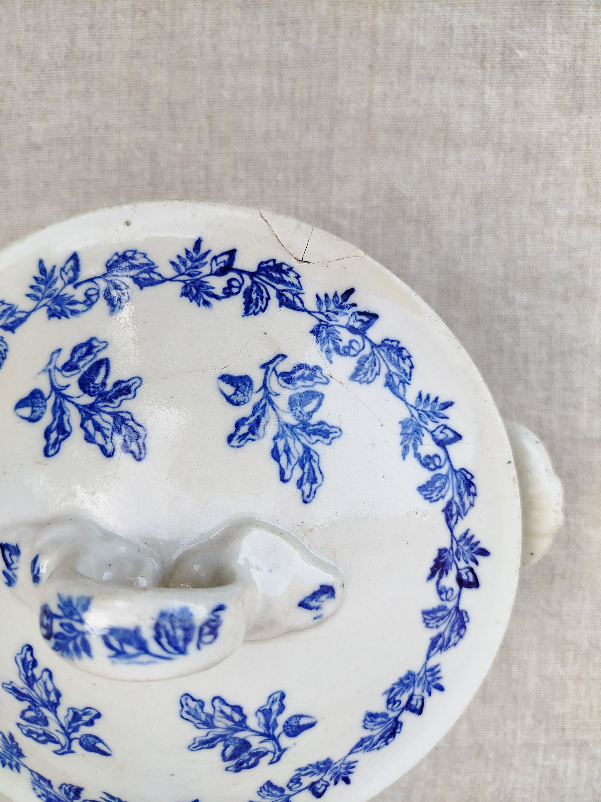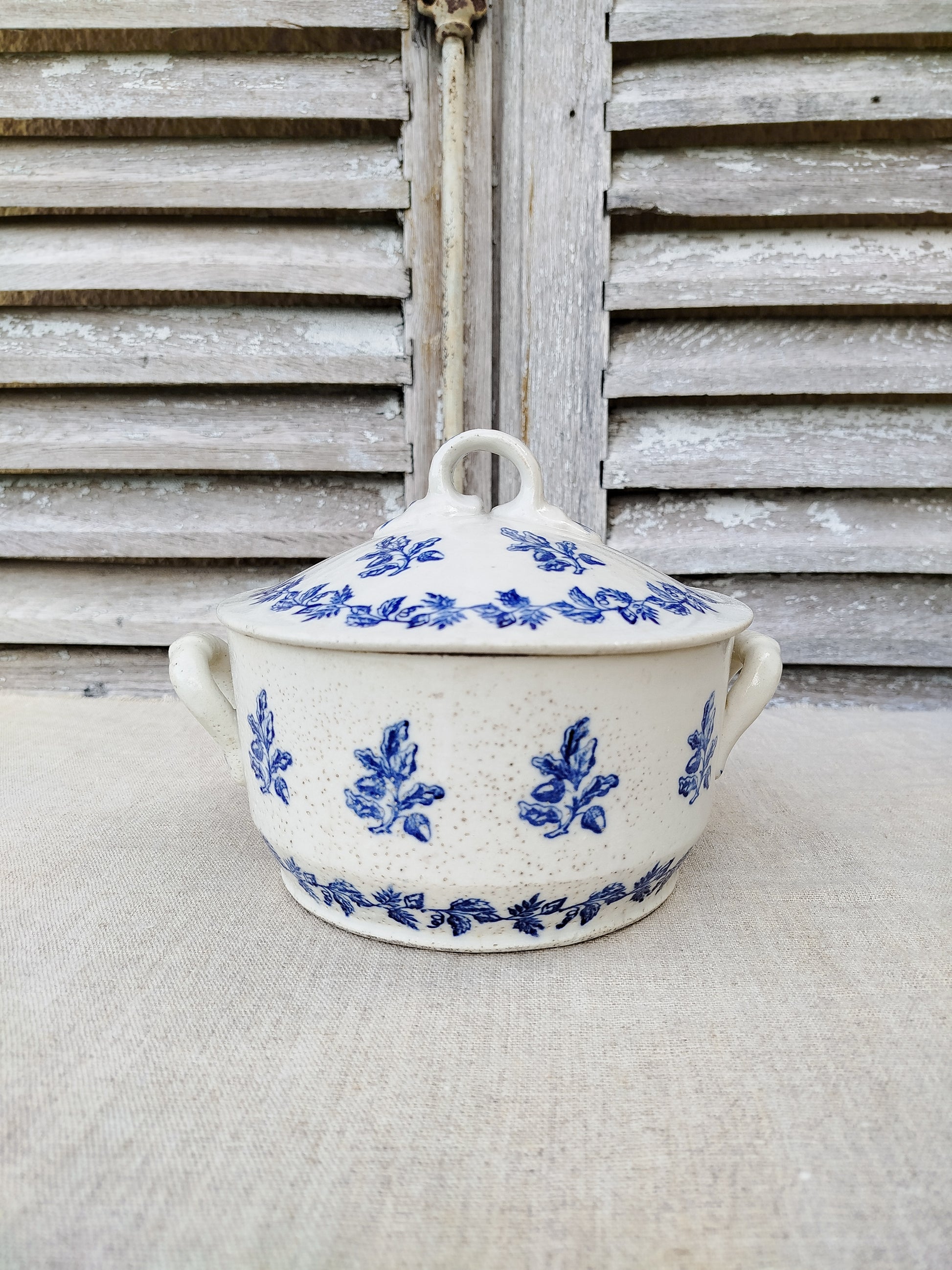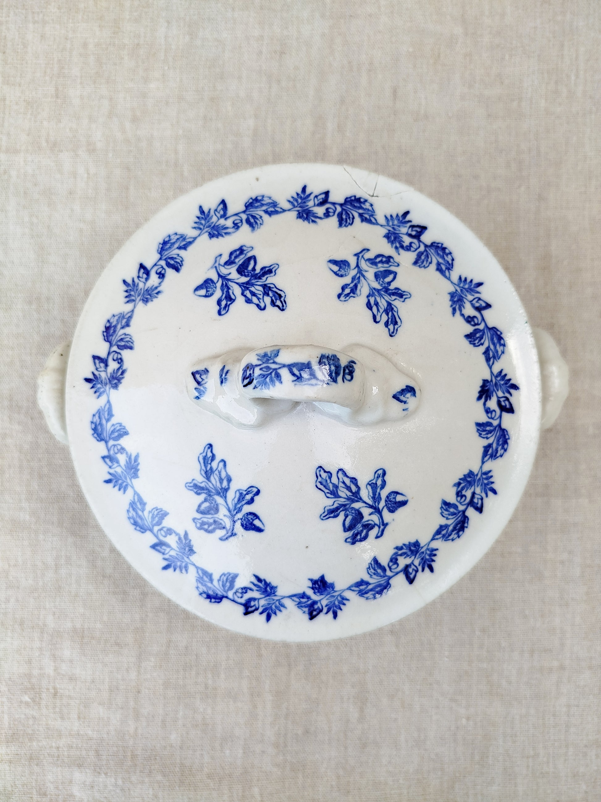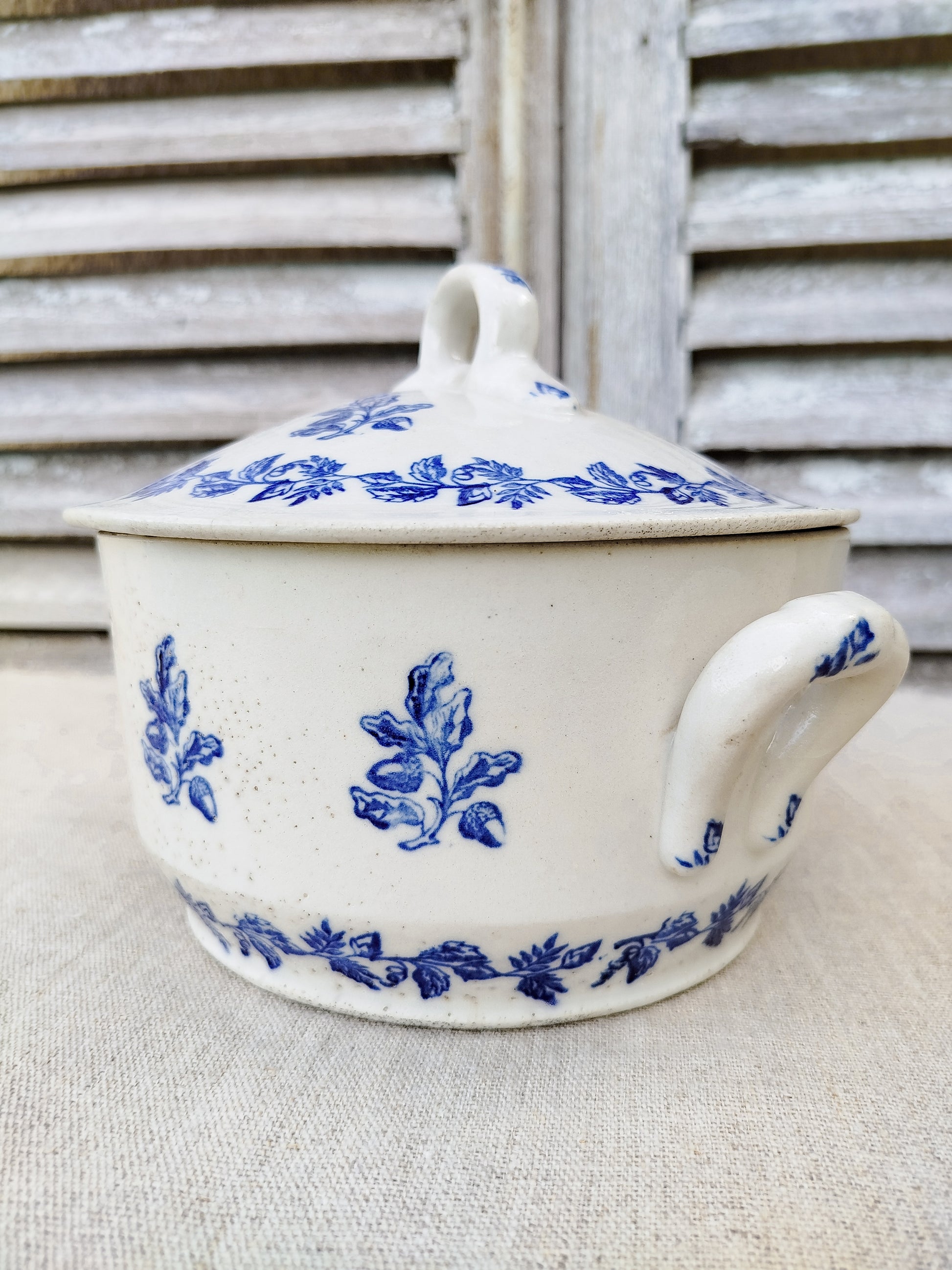 Elle est ornée d'un décor bleu roi, avec comme motif des branches de chêne avec des glands.
