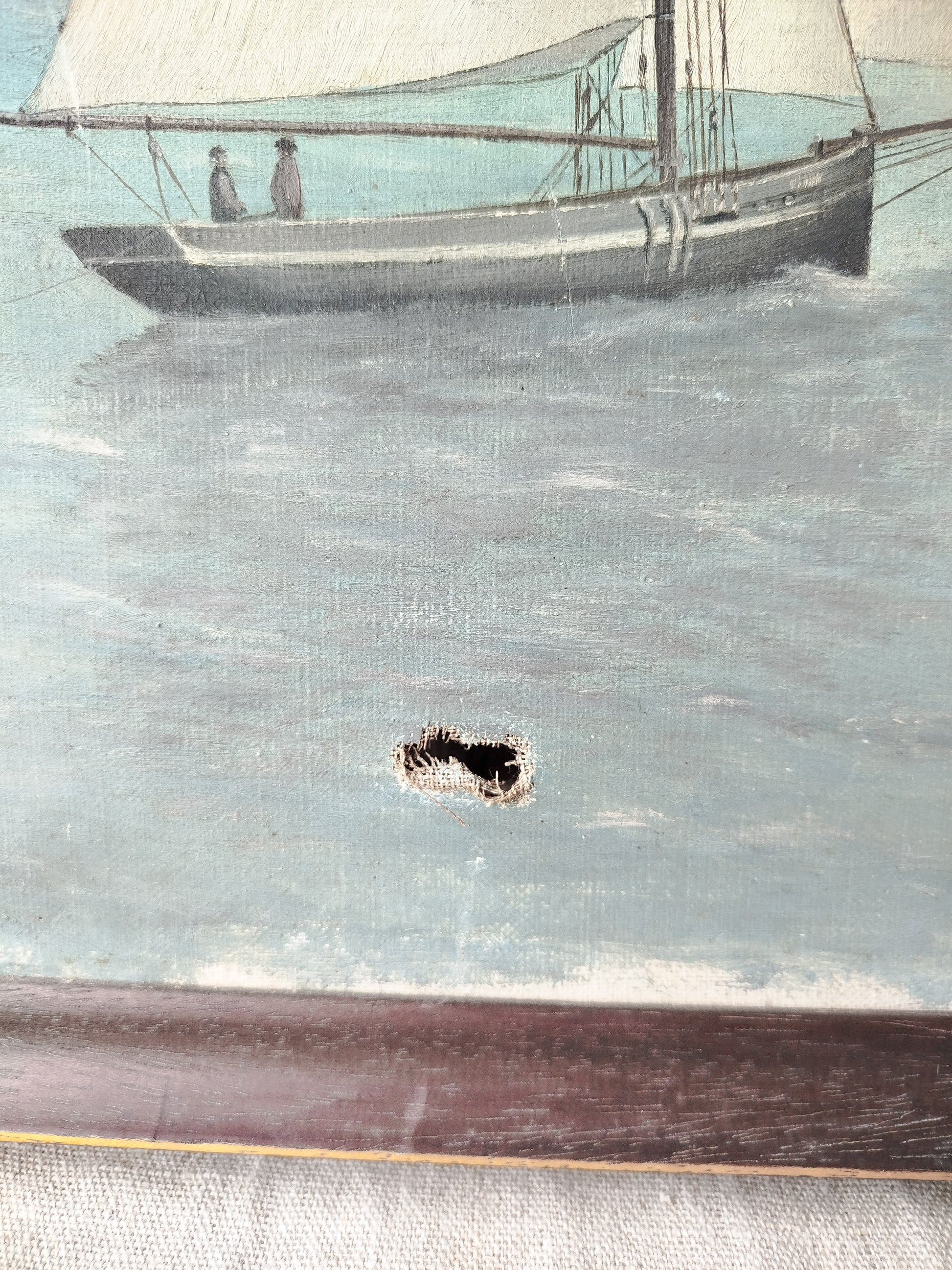 Attention, un trou conséquent est visible en bas de la toile, d'autres micro trous sont a noter. (Au moins 4)