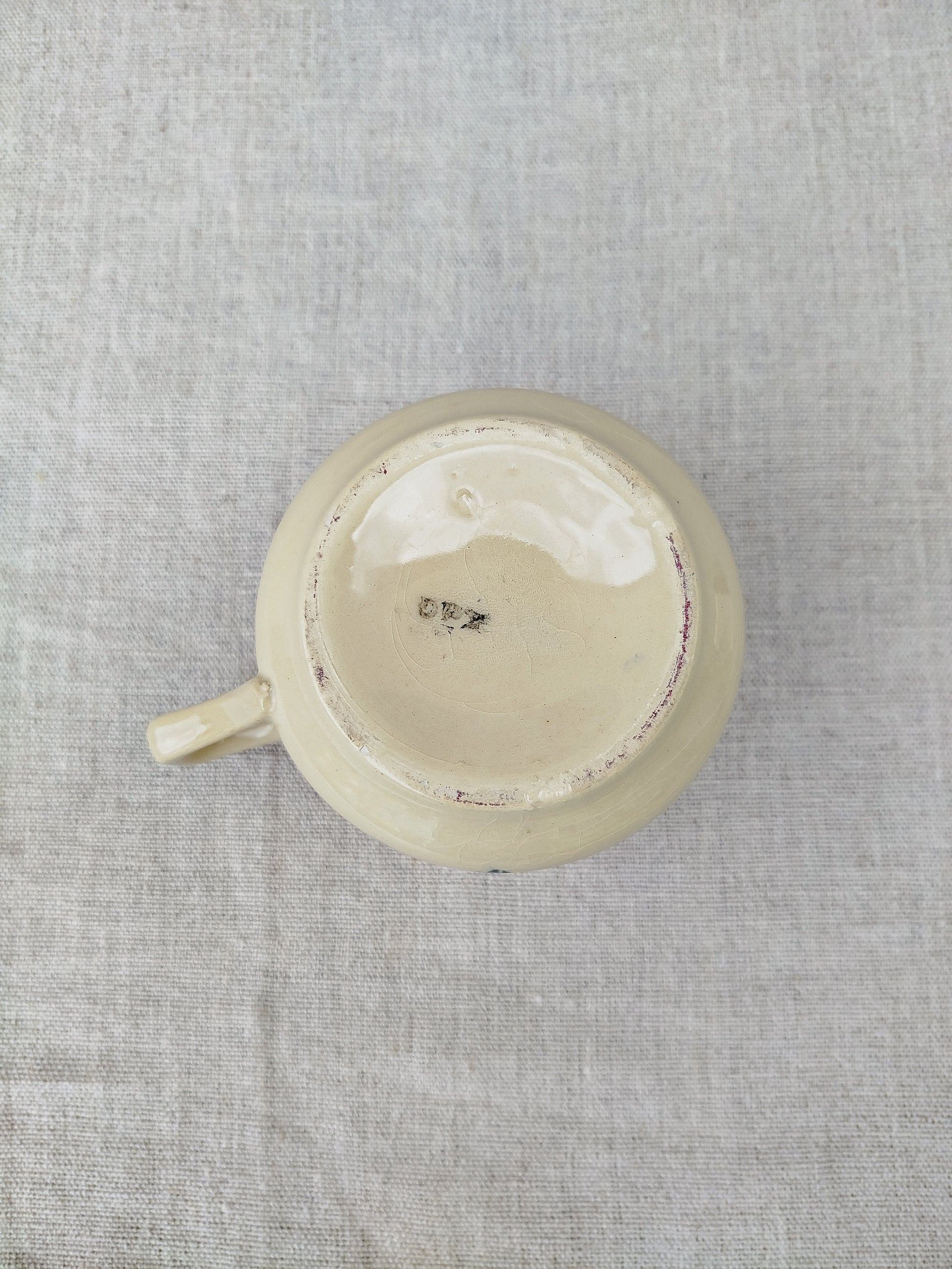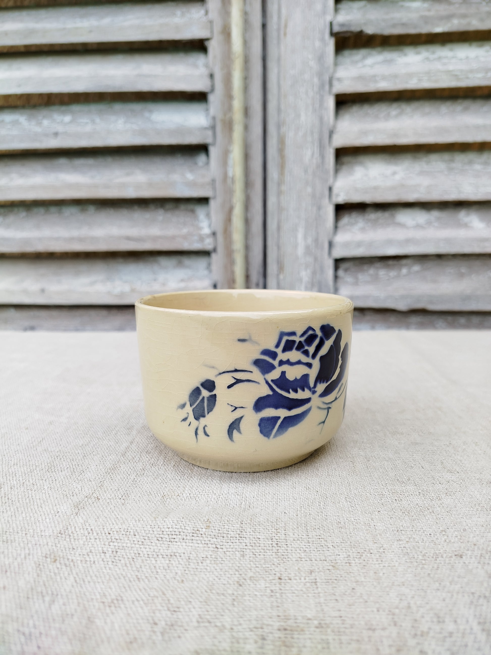 En faïence de couleur beige clair, elle est ornée d'une branche de roses bleues, style pochoir.