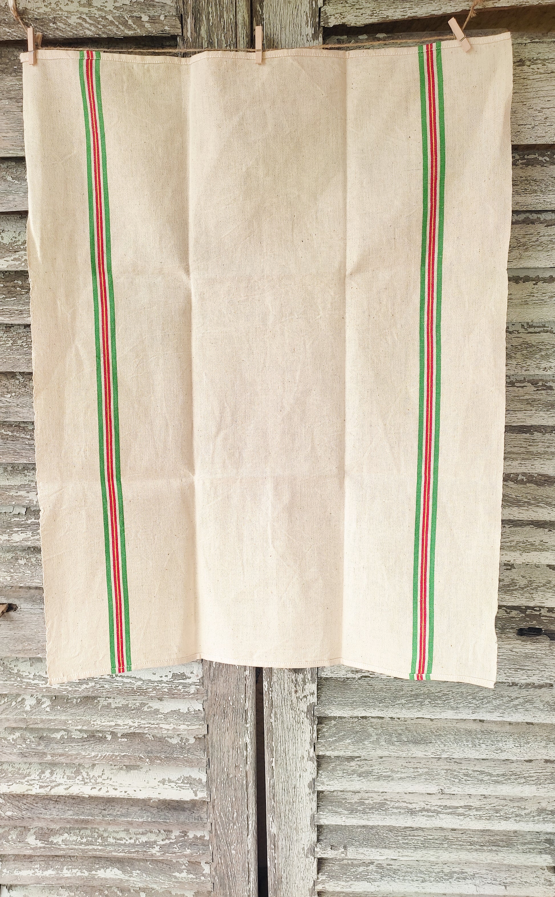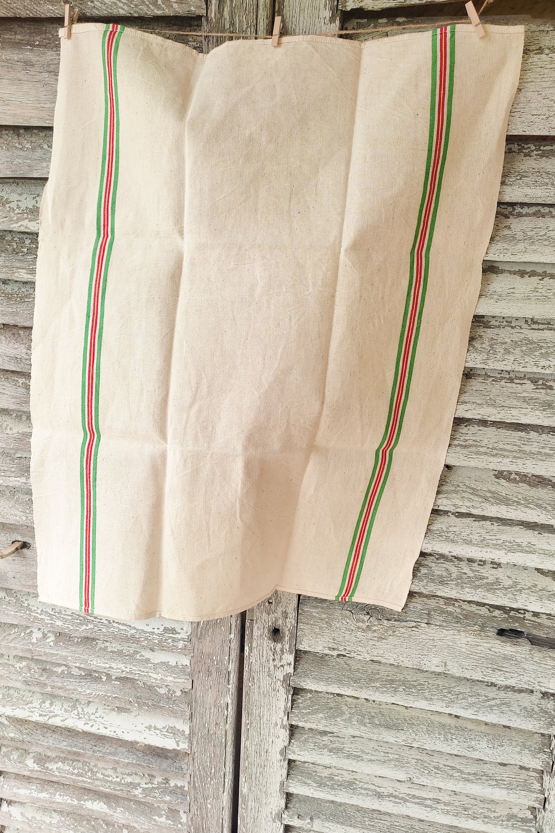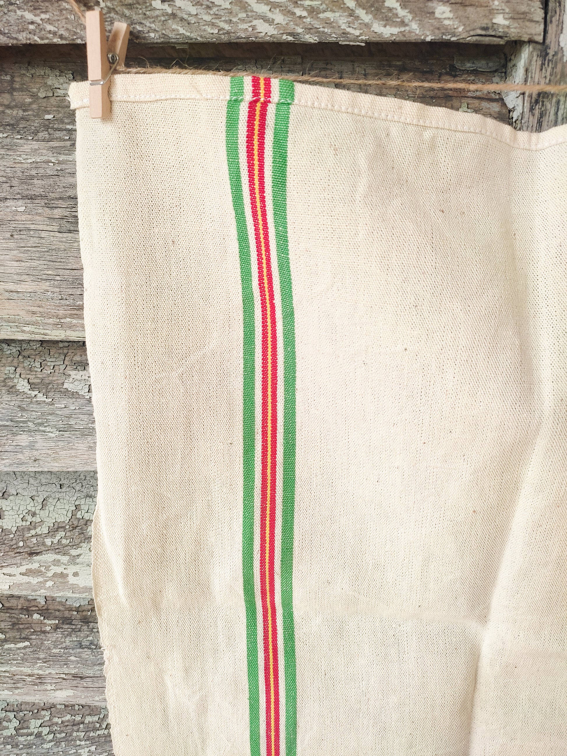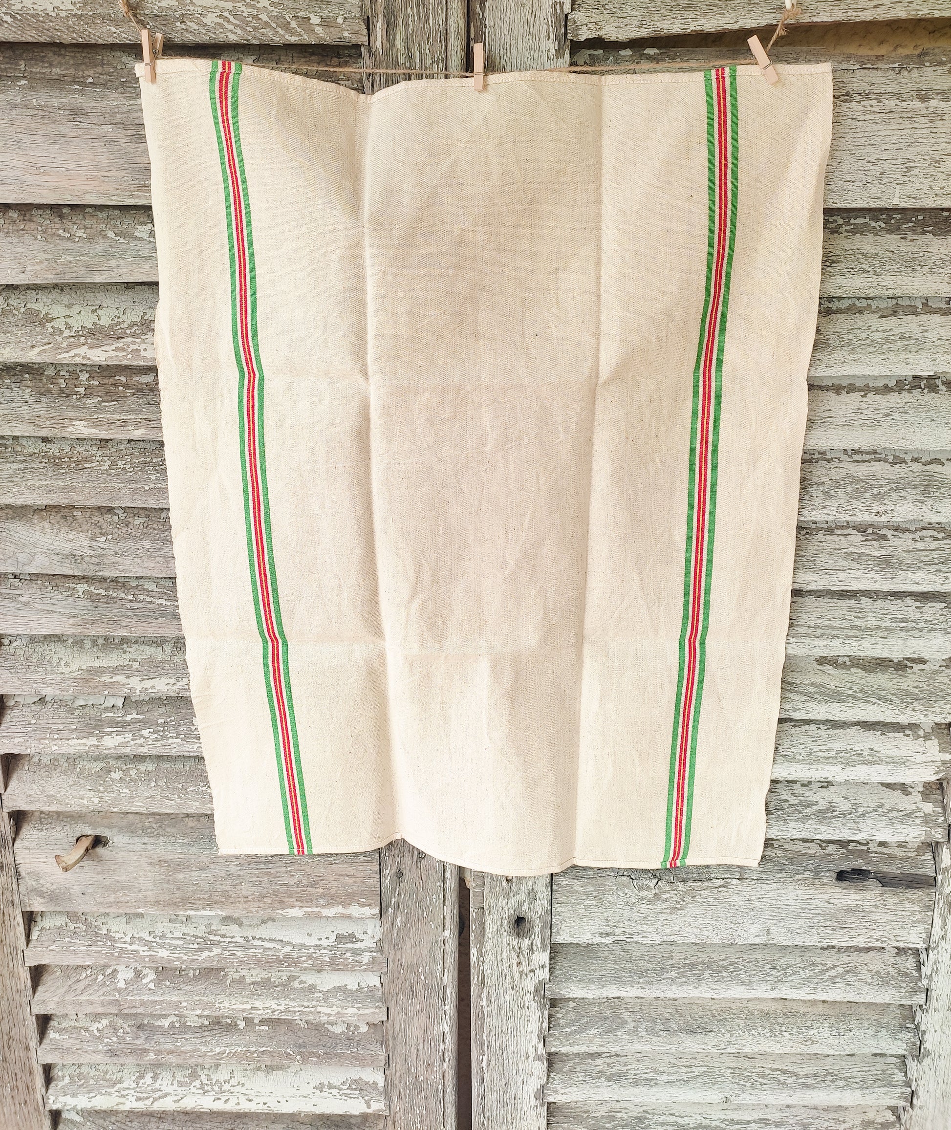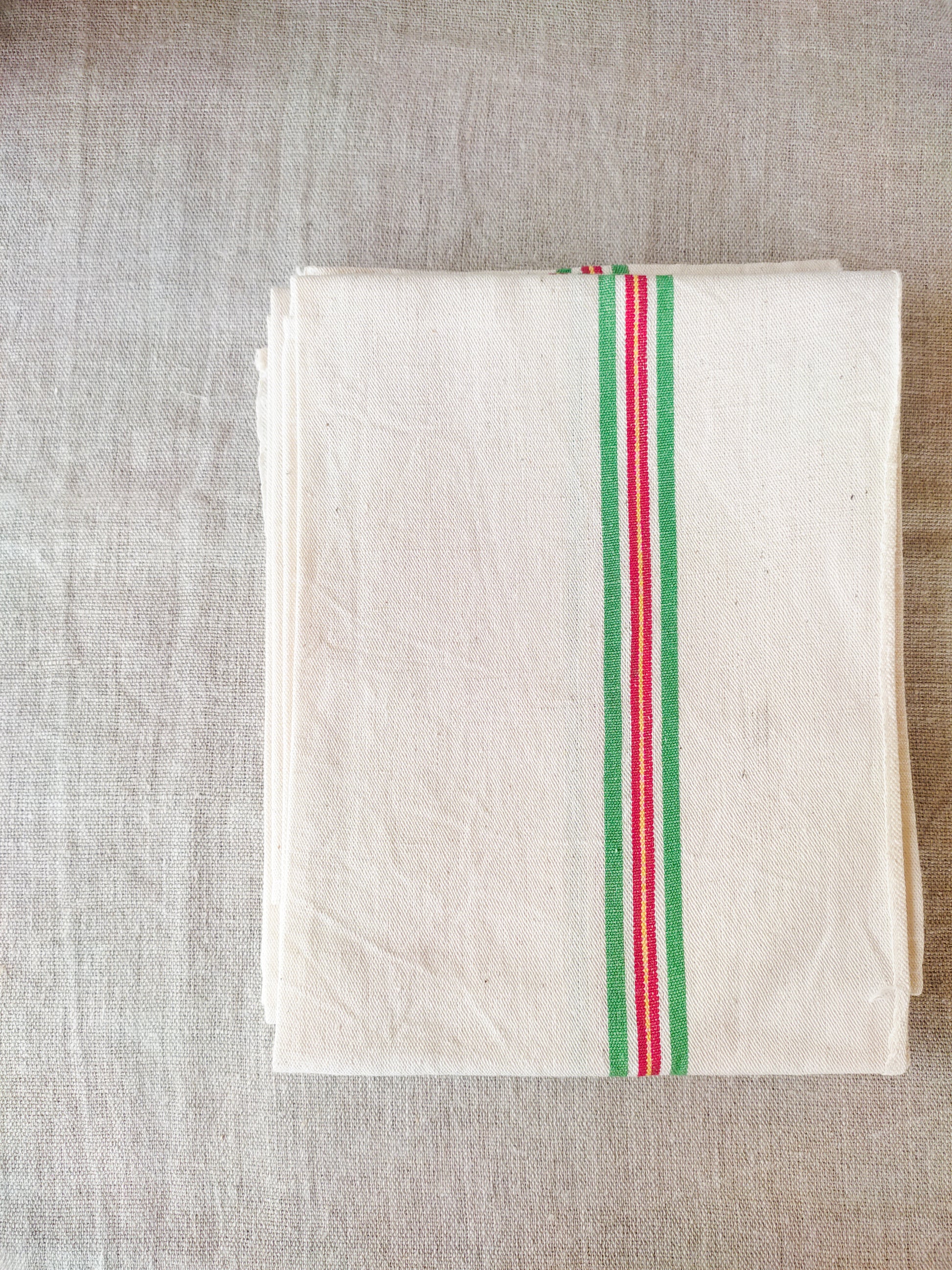 En lin couleur beige clair, deux bandes couleur vert, jaune et rouge sont présentes recto verso.